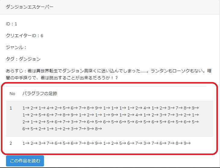 ゲームブック作品を楽しむユーザーがどの選択肢を選んで読み進めたのか、その経緯をユーザー単位で調べることが出来ます。
